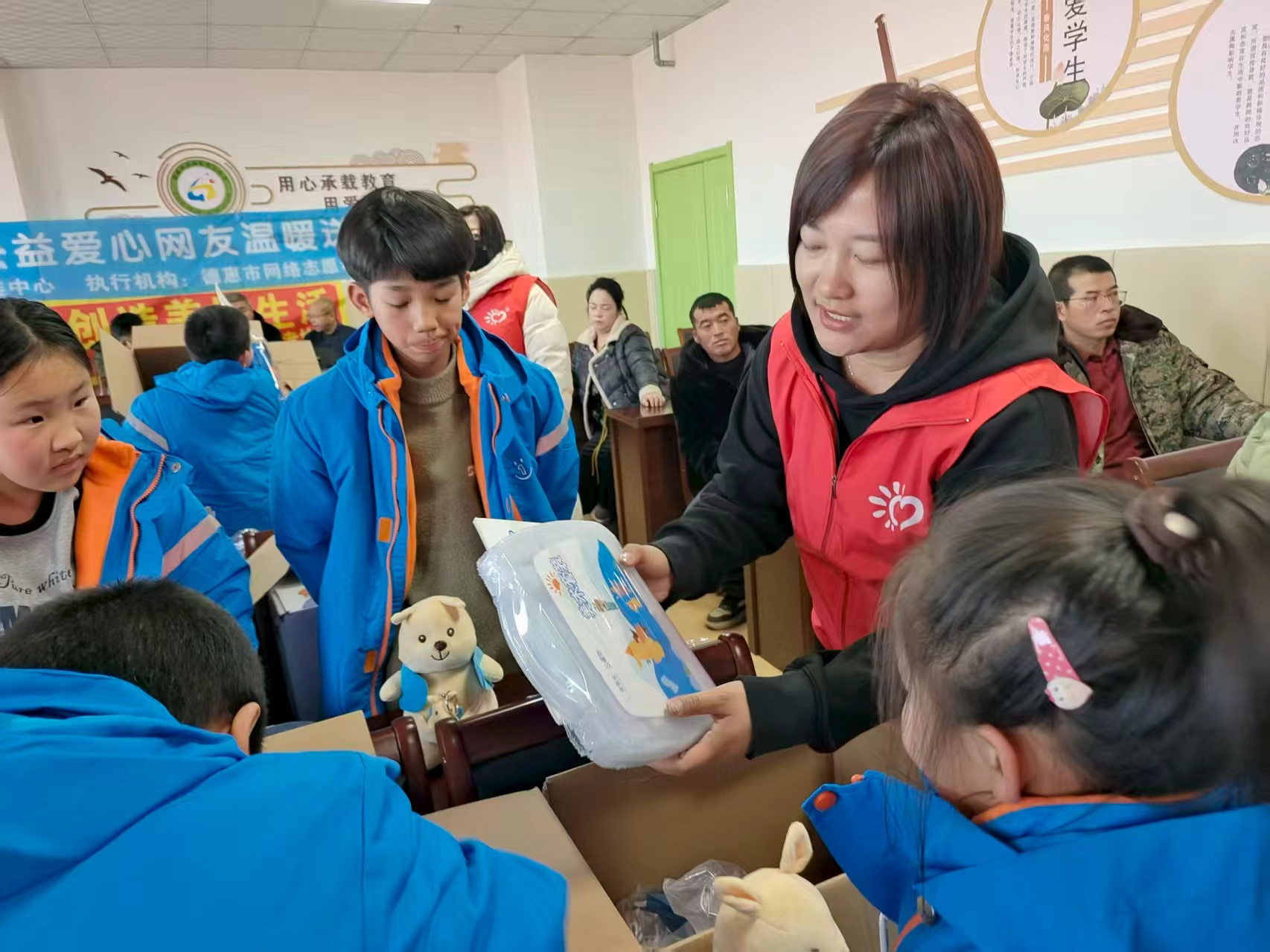 随后,发放仪式正式开始。志愿者们将温暖包一一打开,里面不仅有棉衣棉鞋,还有各类文具用品。志愿者们根据每个孩子的身高、脚码等准确匹配型号,帮助孩子们试穿的同时,耐心询问他们的穿着感受,细心叮嘱保暖事项。还与孩子们一起玩游戏,亲切互动,现场不时响起欢快的笑声,成为这个冬日里最动人的画面。