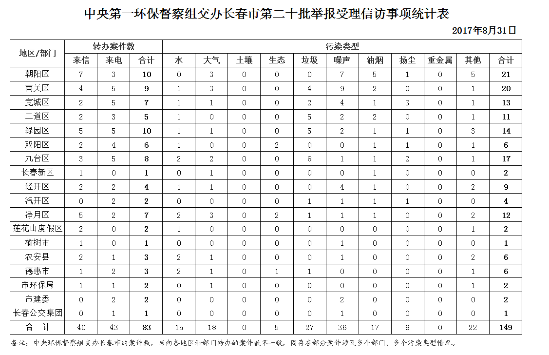 31日,中央第一环境保护督察组向长春市交办了第二十批举报受理信访事项79件(重点案件7件),共涉及149个环境问题。其中涉水问题15个,大气问题18个,生态问题5个,垃圾问题27个,噪声问题36个,油烟问题17个,扬尘问题9个,其他问题22个。共涉及15个县(市)区、开发区和2个市直部门,其中朝阳区10件,南关区9件,宽城区7件,二道区5件,绿园区10件,双阳区6件,九台区8件,长春新区1件,经开区4件,汽开区2件,净月区7件,莲花山度假区2件,榆树市1件,农安县3件,德惠市3件,市环保局2件,市建委2件,长春公交集团1件。