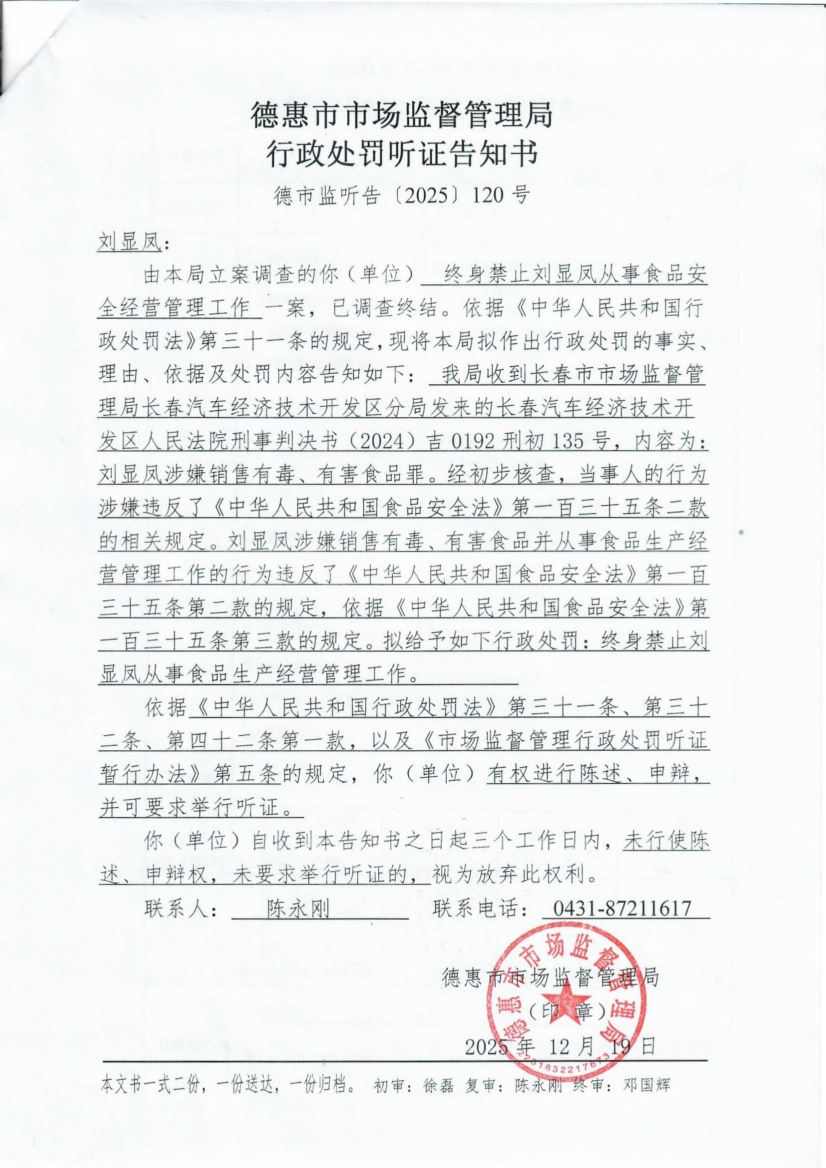 终身禁止刘显凤从事食品安全经营管理工作的行政处罚听证告知书