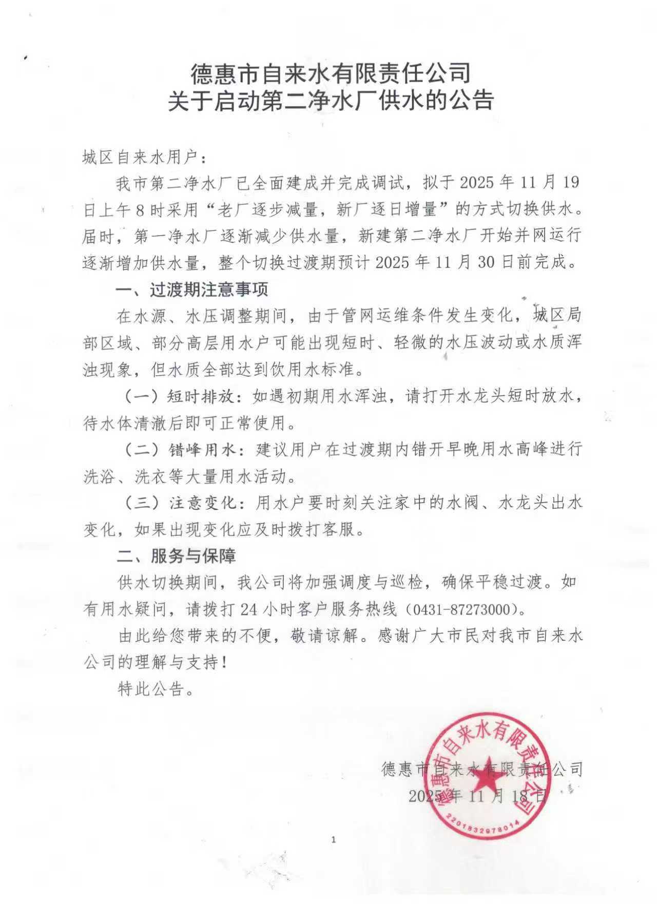 德惠市自来水有限责任公司关于启动第二净水厂供水的公告