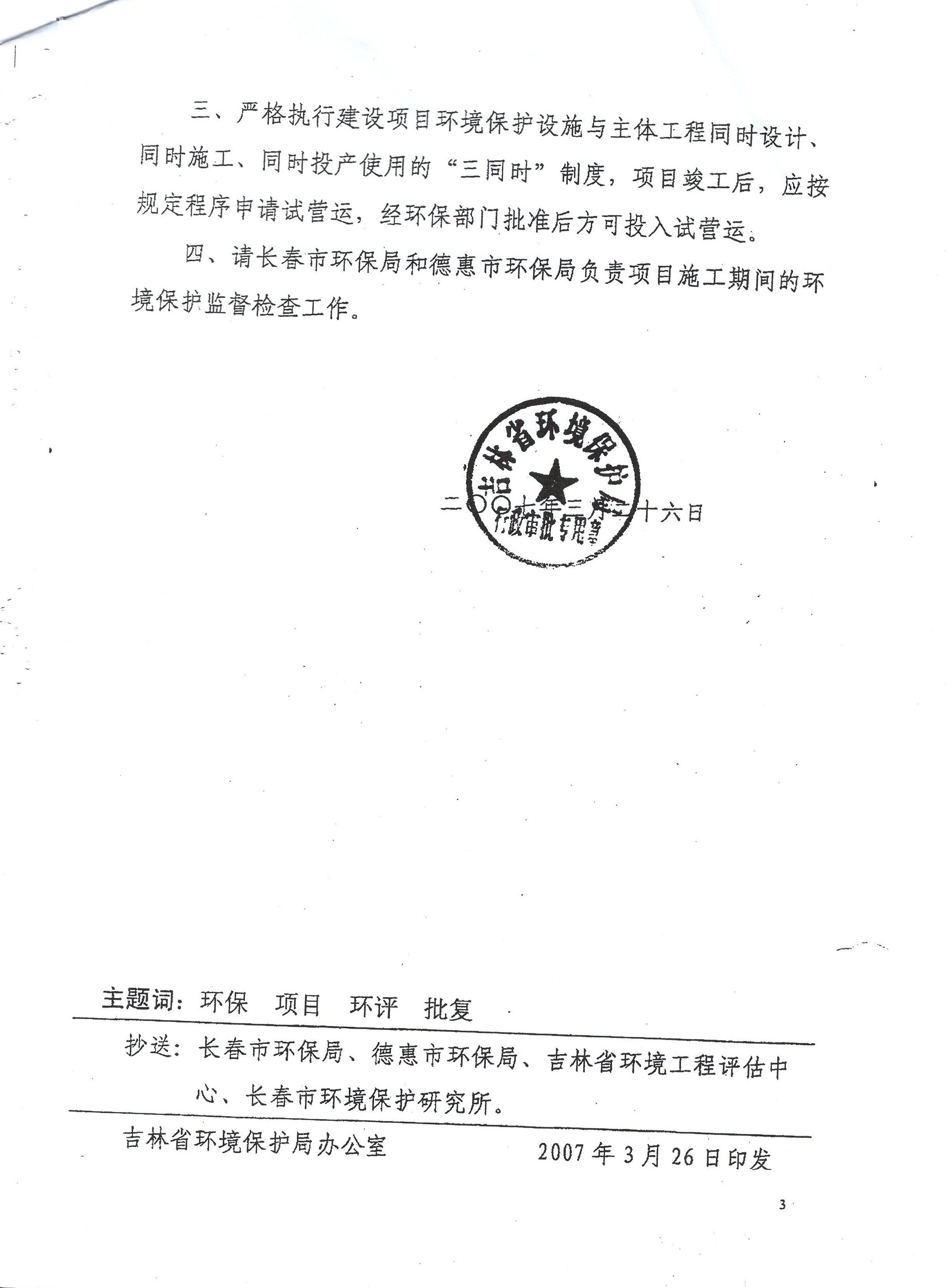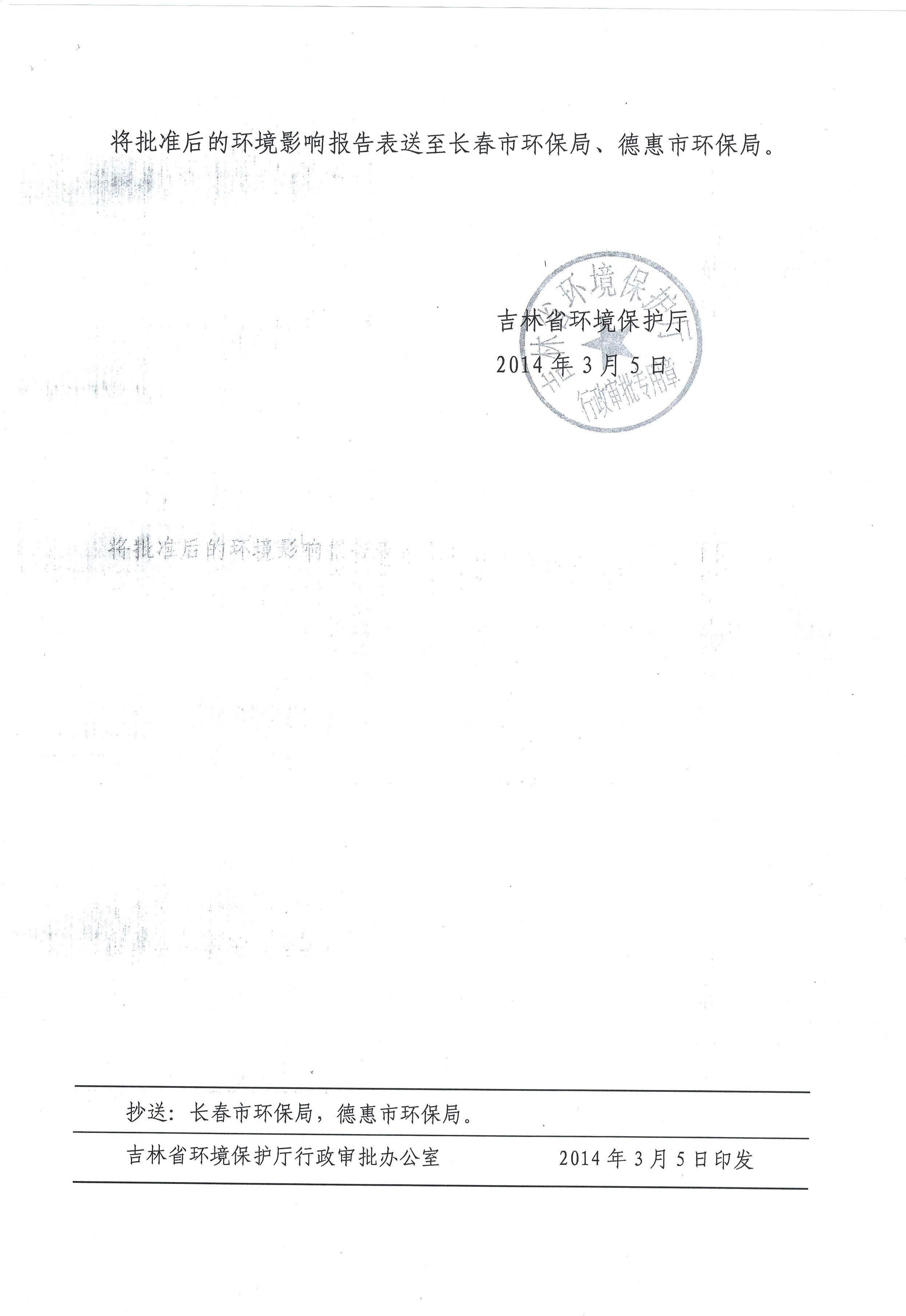 2、德惠市污水处理厂再生水利用一期工程环境影响报告表的批复