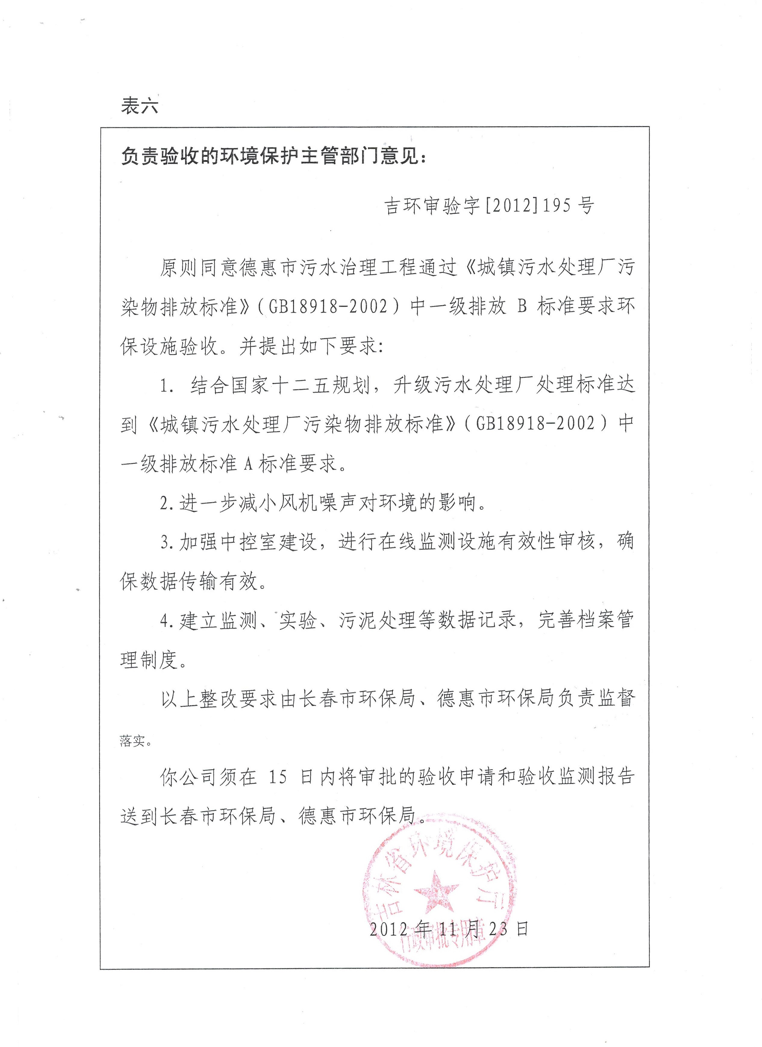 1、德惠市污水处理厂项目环境影响报告书的批复及验收意见和批复